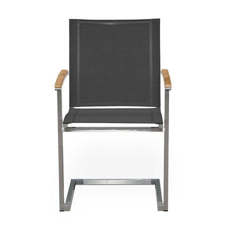 Alzette Freischwinger stapelbar Edelstahl mit Batyline und Teakholzarmlehne