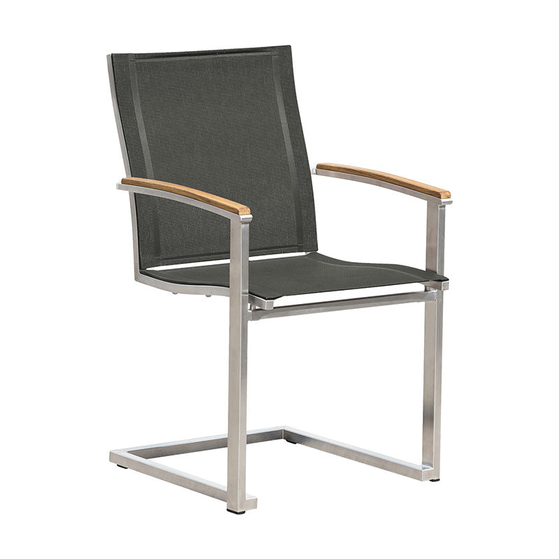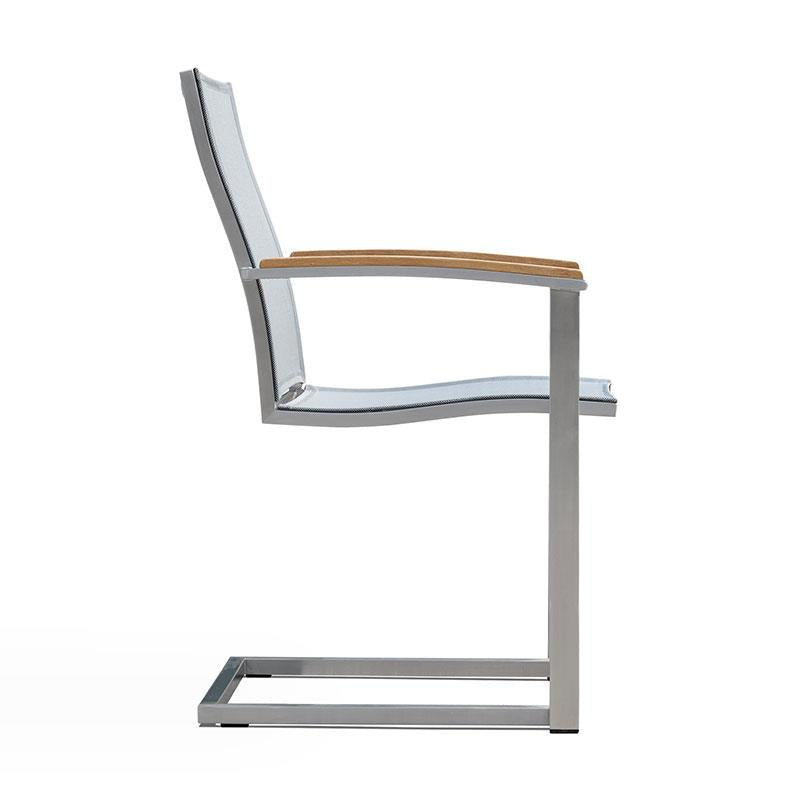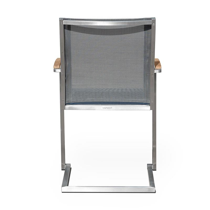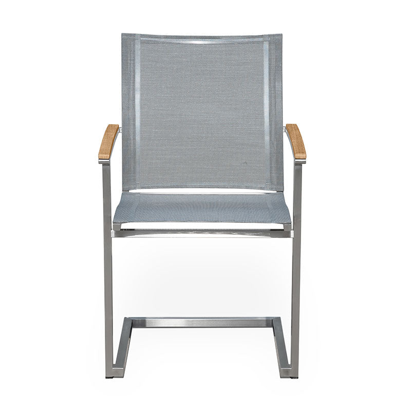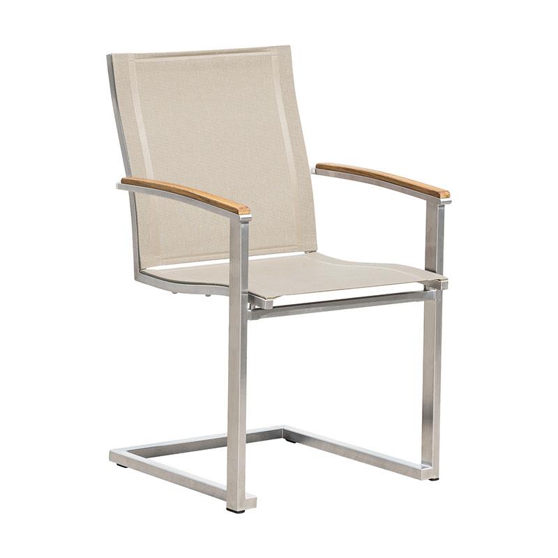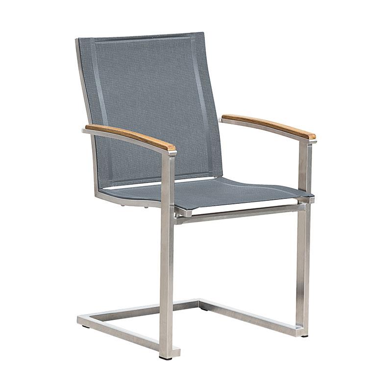 Alzette Freischwinger stapelbar Edelstahl mit Batyline und Teakholzarmlehne