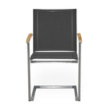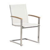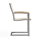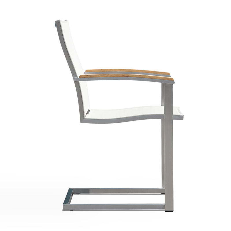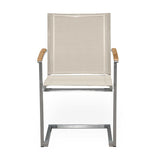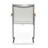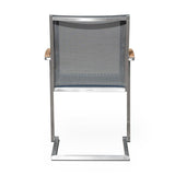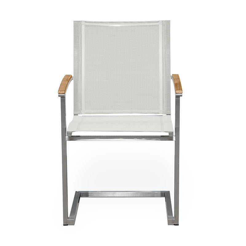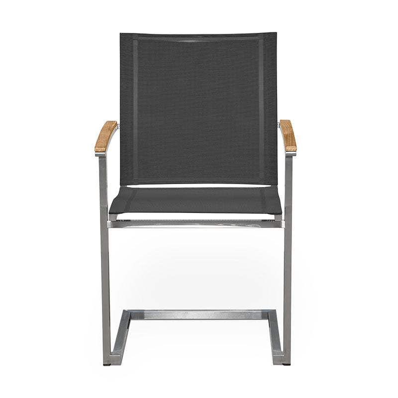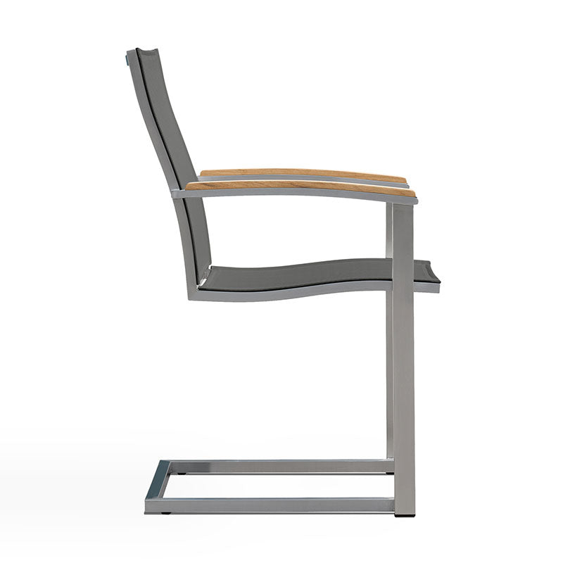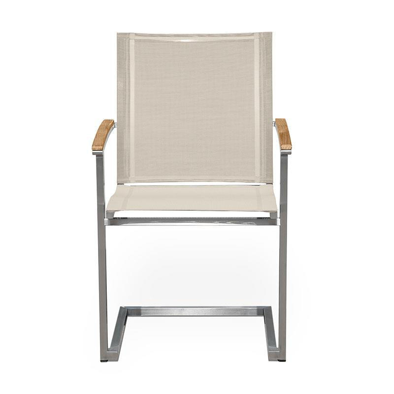 Alzette Freischwinger stapelbar Edelstahl mit Batyline und Teakholzarmlehne
