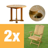 Denver Set 80 bestehend aus Denver Runder Tisch 80 und Denver Faltstühlen mit Armlehnen Teak mit Messingbeschlägen - ohne Schirmloch / 2 Denver Faltstühle ist auf Lager und wird versandt, sobald es wieder verfügbar ist