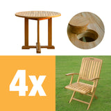 Denver Set 80 bestehend aus Denver Runder Tisch 80 und Denver Faltstühlen mit Armlehnen Teak mit Messingbeschlägen