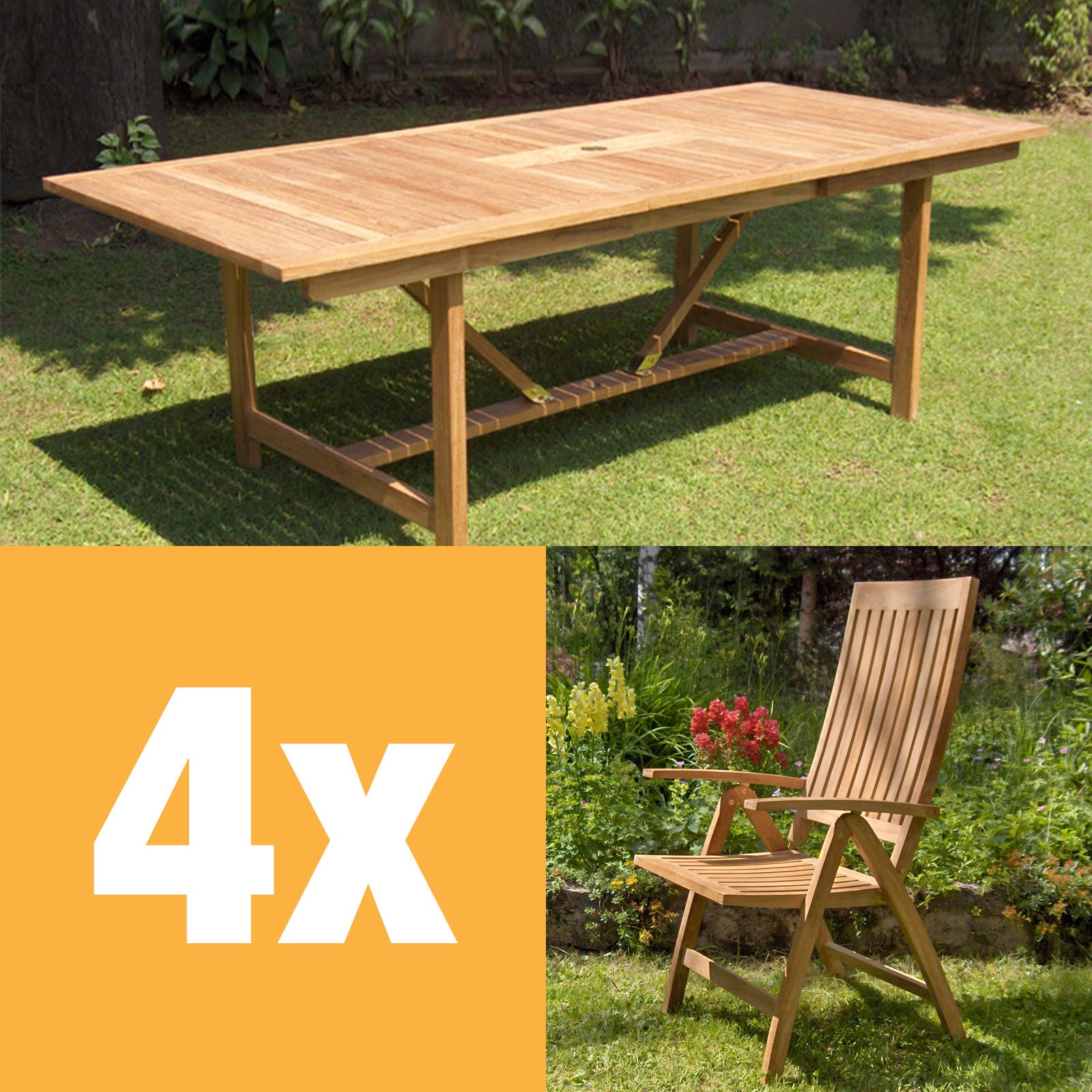 Elegance Recliner Set 220 bestehend aus Elegance Ausziehtisch 220/160 x 100 und Elegance Hochlehnern Teak mit Messingbeschlägen