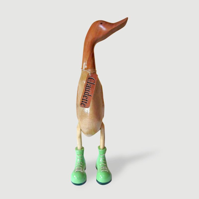 Die riesengroße Ente »Claudette« mit ihren beeindruckenden 65 cm ist nicht nur ein Blickfang, sondern bringt auch eine verspielte Note in jeden Außenbereich. Diese aufrecht stehende Ente aus hochwertigem, lackiertem Teakholz ist kunstvoll mit eleganten, geschnürten grünen Schuhen ausgestattet, die ihr einen ganz besonderen Charme verleihen.