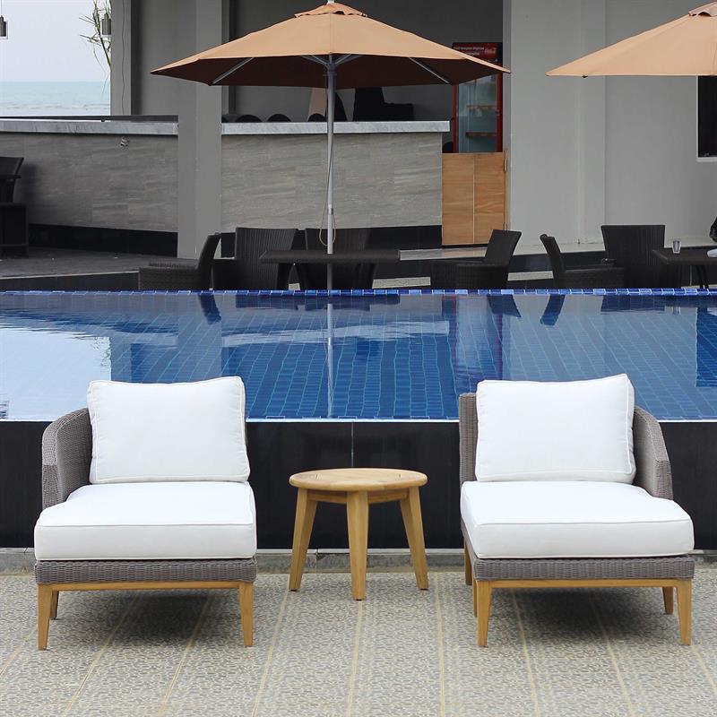 - Robuste Konstruktion: Der Geflechtkorpus ruht auf einem stabilen Teakholzunterbau, der für eine lange Lebensdauer sorgt.