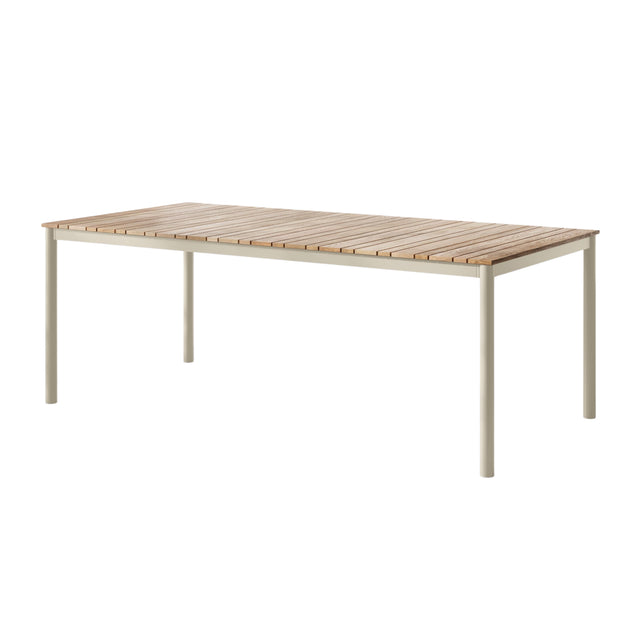 Der Mood Nova Tisch in Sandy Gray ist ein moderner Tisch mit einem sandgrauen Gestell und einer einzigartigen Tischplatte aus Teakholzlatten in zwei verschiedenen Breiten. Dieses elegante Design erzeugt einen dynamischen Ausdruck, perfekt für den Außenbereich. Die neutrale Farbe des Gestells in Kombination mit der strukturierten Tischplatte verleiht dem Tisch ein zeitloses und stilvolles Aussehen.