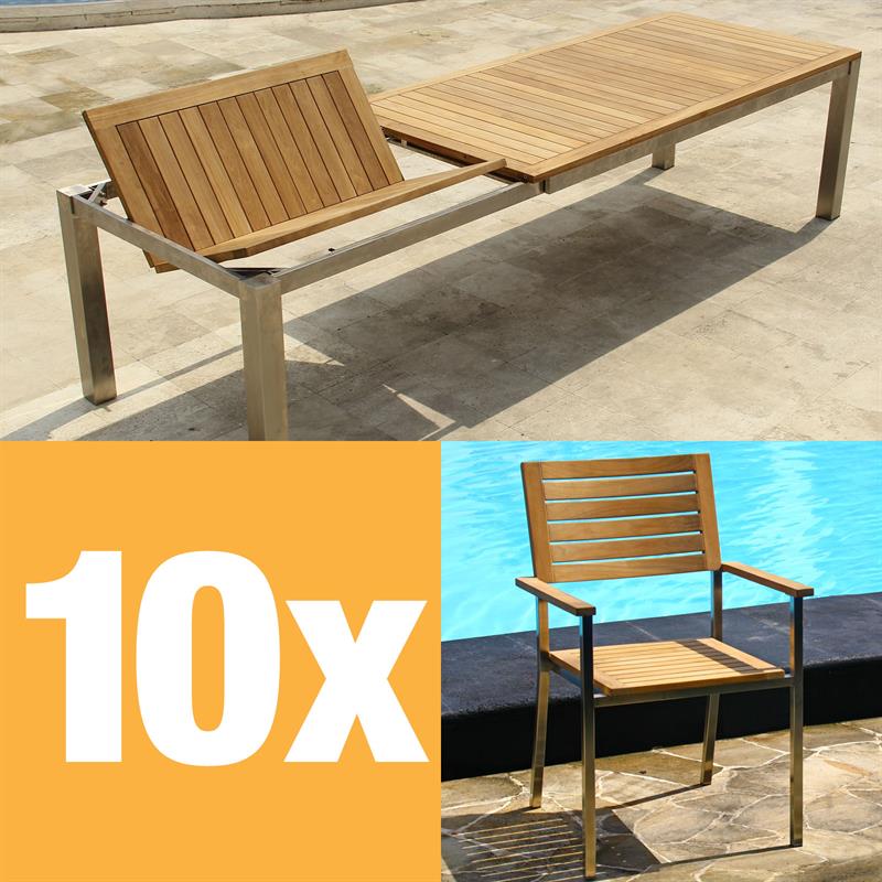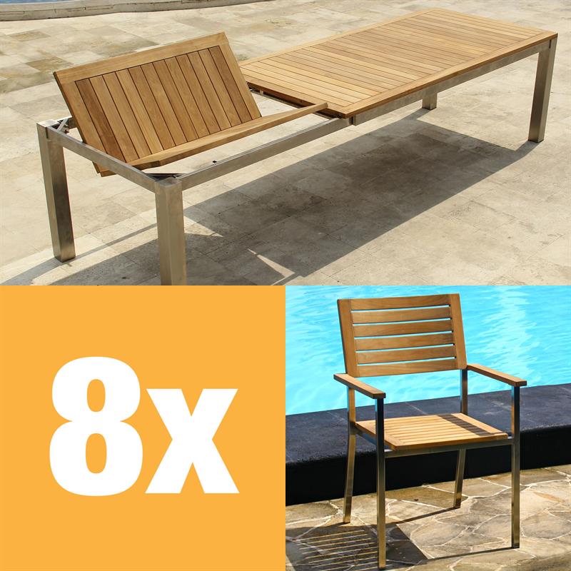 Moselle Frontausziehtisch Set 310 bestehend aus Florence Frontausziehtisch 310/210 x 100 Teak mit Edelstahlgestell und Moselle Stapelstühlen Teak mit Edelstahl