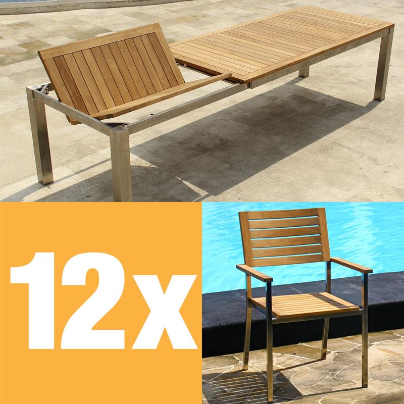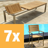 Moselle Frontausziehtisch Set 310 bestehend aus Florence Frontausziehtisch 310/210 x 100 Teak mit Edelstahlgestell und Moselle Stapelstühlen Teak mit Edelstahl - 6 Moselle Stapelstuhl - Zertifiziertes Teak GRADE A + Edelstahlgestell ist auf Lager und wird versandt, sobald es wieder verfügbar ist