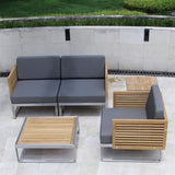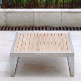 Der Tessin Modul Lounge Hocker / Beistelltisch vereint modernen Stil mit durchdachter Funktionalität. Die Kombination aus elegantem, mattgebürstetem Edelstahl und feingliedriger Teakholz-Lattung verleiht diesem Möbelstück ein einzigartiges Erscheinungsbild.